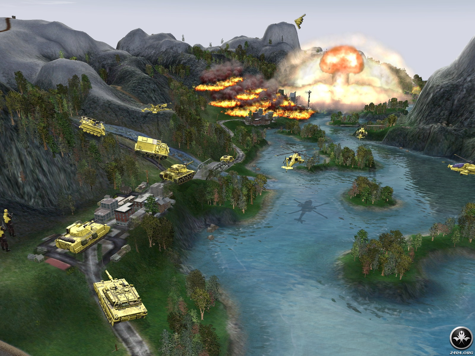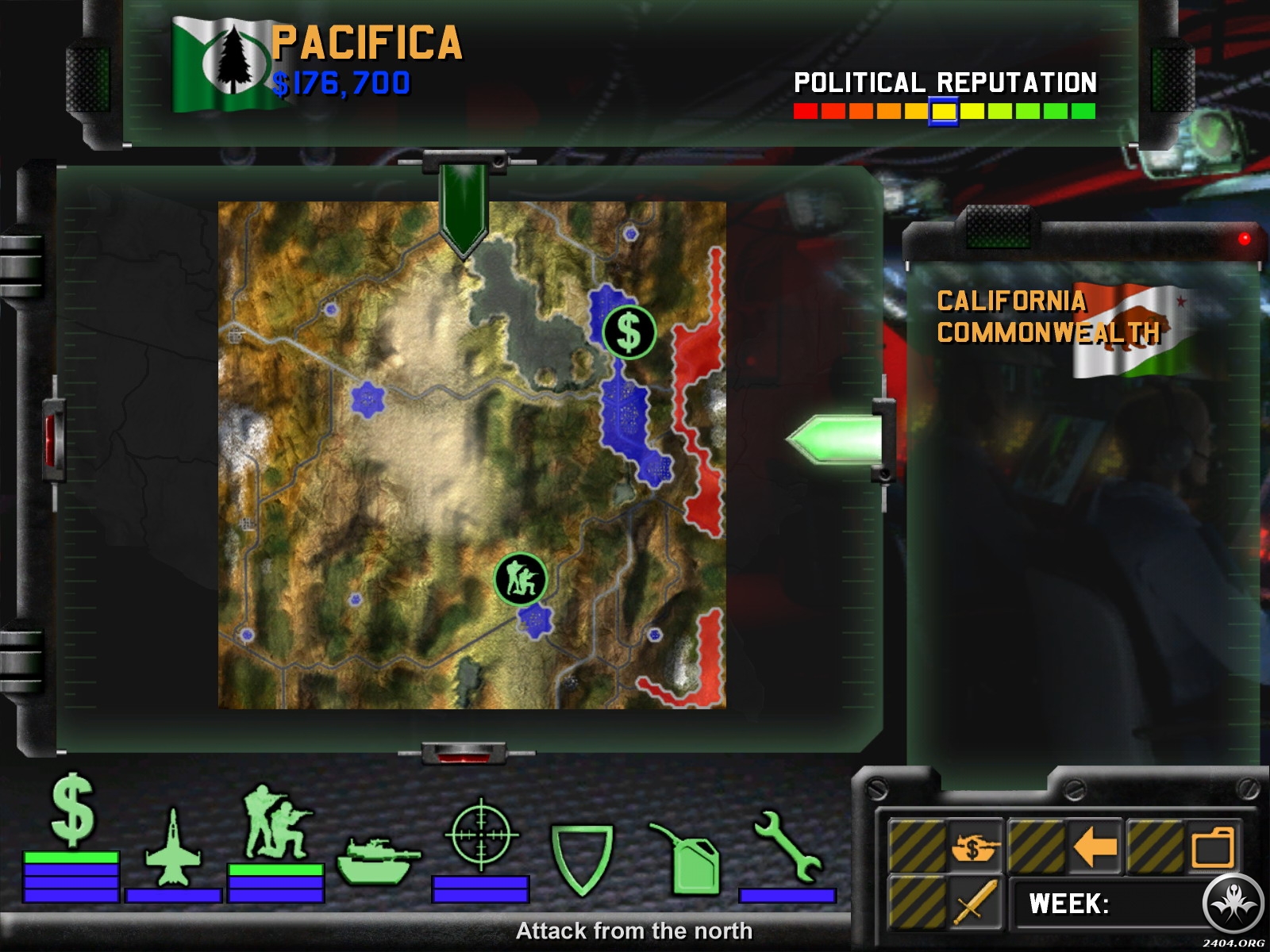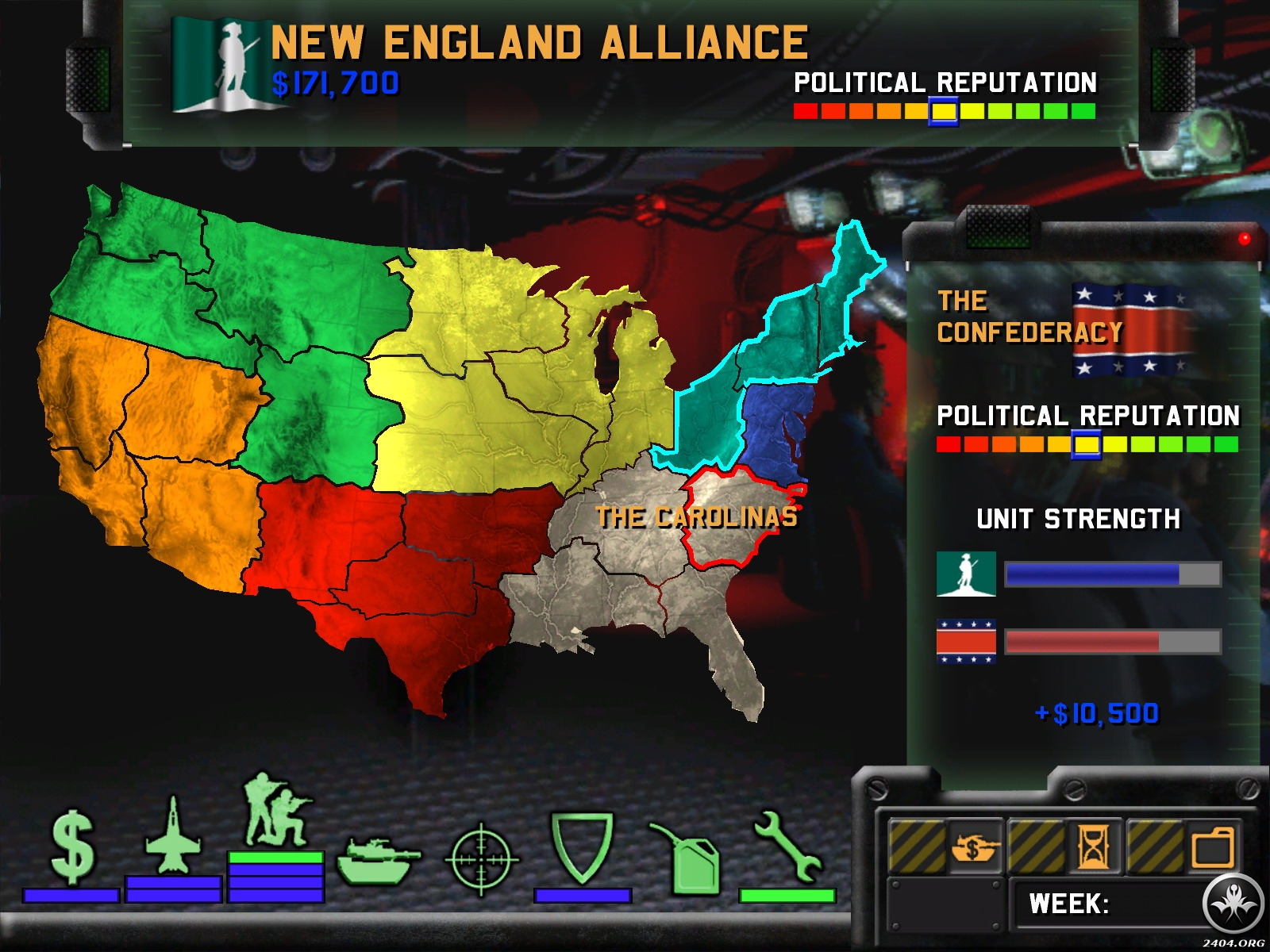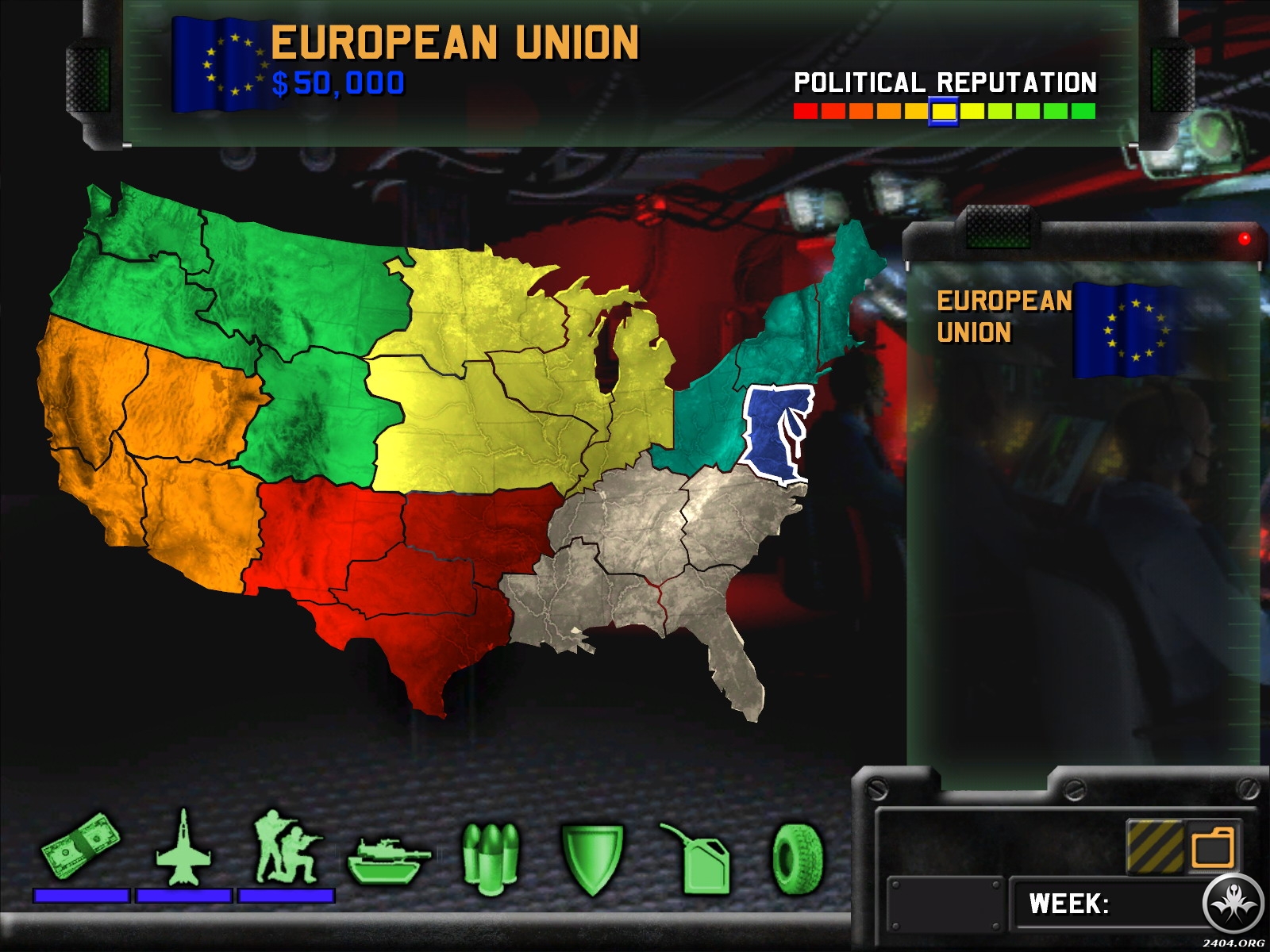 Following a great increase in terrorism, internal strife, and ultimately, the nuclear destruction of Washington, D.C., the United States shatters into a half-dozen nation-states that descend into war. Take the helm of one of these newfound sovereignties (or the â€peacekeeping†European Expeditionary Force) and struggle to reunify America…by any means necessary!